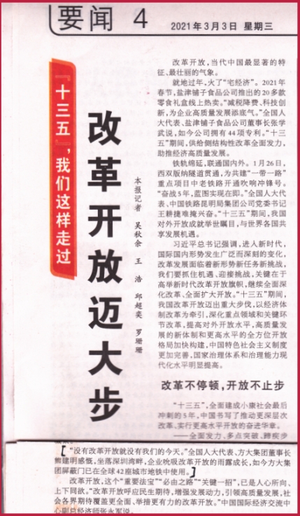 就地過年,火了“宅經濟”。2021年春節,鹽津鋪子食品公司推出的20多款零食禮盒線上熱賣。“減稅降費、科技創新,為企業高質量發展添底氣。”全國人大代表、鹽津鋪子食品公司董事長張學武說,如今公司擁有44項專利。“十三五”期間,供給側結構性改革全面發力,助推經濟高質量發展。