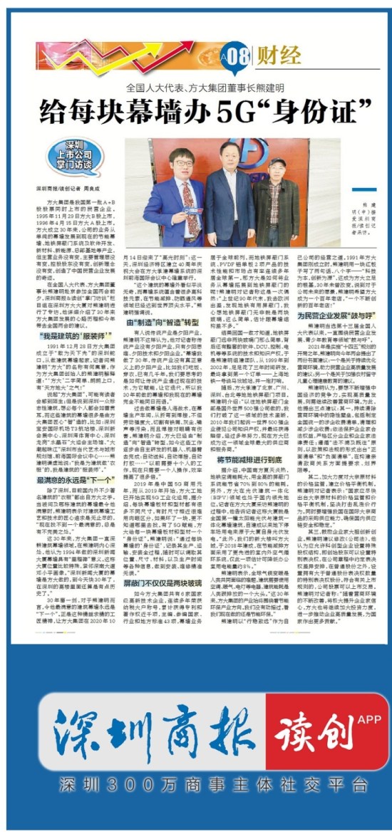 這30年來(lái),方大集團(tuán)一直深耕建筑幕墻領(lǐng)域。在熊建明內(nèi)心深處,他認(rèn)為1994年做的深圳新聞大廈幕墻具有“里程碑”意義。這棟大廈位置比較特殊,緊鄰深南大道鄧小平畫(huà)像?!吧钲谛侣劥髲B的幕墻是方大做的,到今天快30年了,在深圳的高樓里面還算是有點(diǎn)歷史了?!?/span>